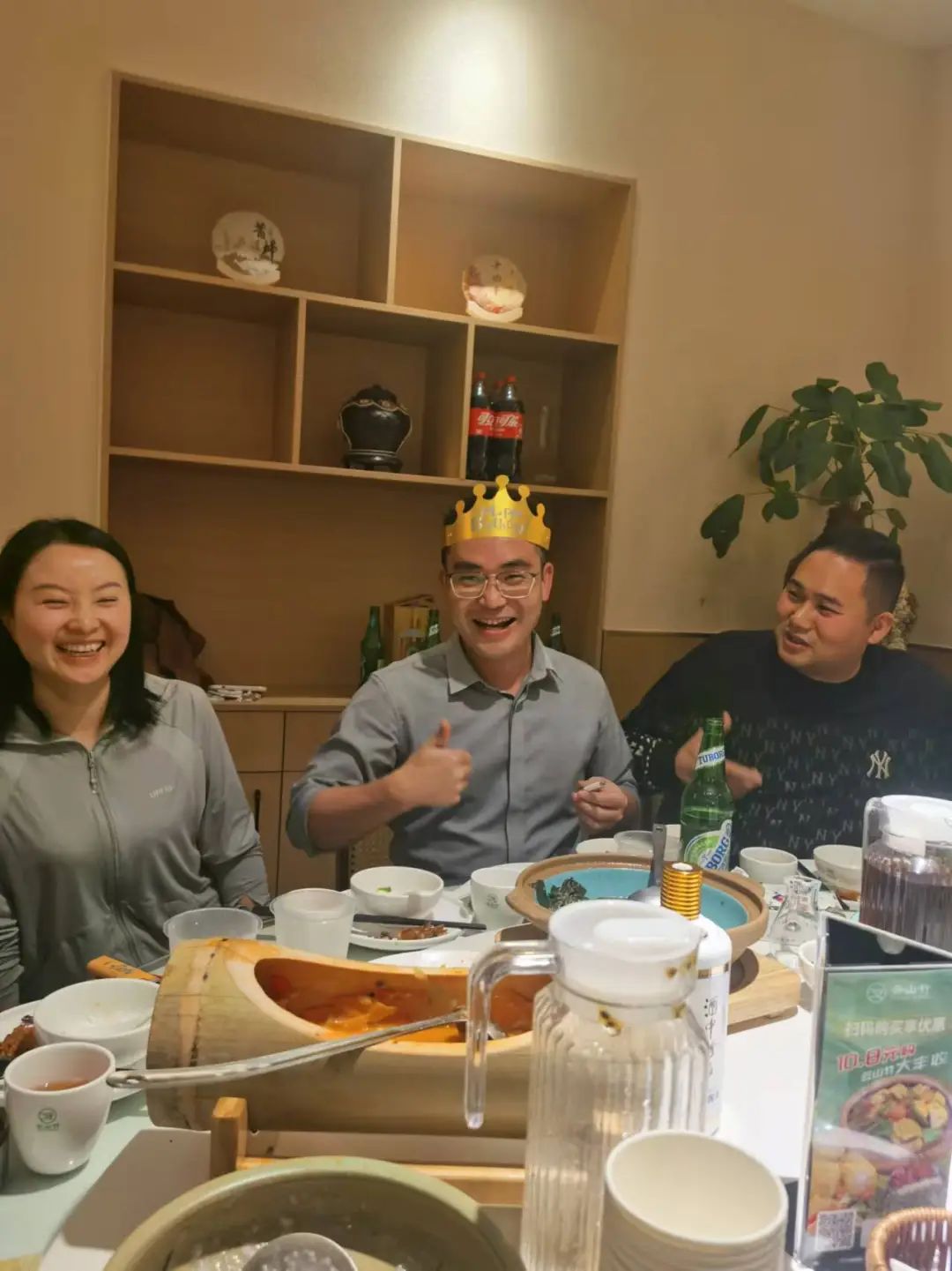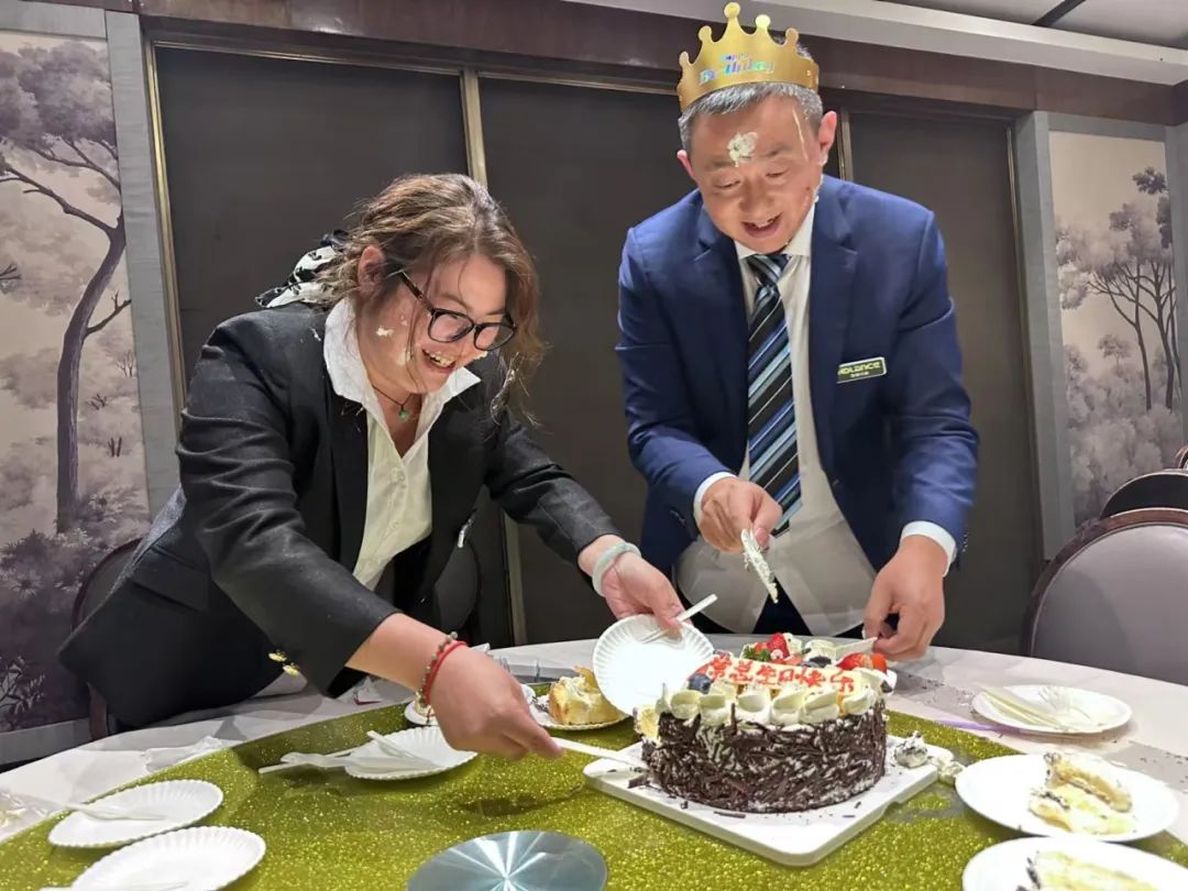 展會期間,恰逢鄭州錢立周總、河北常大偉總,云南鄢梅光總生日,公司特意為三位老總安排了生日晚宴、生日蛋糕和生日祝福。河北常大偉總的愛人發表了感言:我作為妻子還沒有考慮到,但公司給常大偉想到了,感謝公司、感謝公司領導,我們必將再接再厲。我們大體能猜到常大偉許愿時的想法:共祝攬盛事業百歲壽昌。